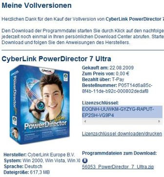11. User will be redirected to My Downloads page (”Meine Vollversionen”), where the license key, EOQNH-UUWKM-GYZYG-RAPUT-EP2SH-VG9P4 (everyone gets this same serial key), for activation will be shown, and then setup installer for CyberLink PowerDirector 7 Ultra can be downloaded. The installation file 56053_PowerDirector_7_Ultra.zip has the size of 617 MB, is the image of the retail version of PowerDirector 7 Ultra CD. So the trial version of CyberLink PowerDirector 7 Ultra does not accept this activation code. It will install CyberLink PhotoNow, CyberLink Power Director, Smartsound Quicktracks Plugin and/or Quicktime.