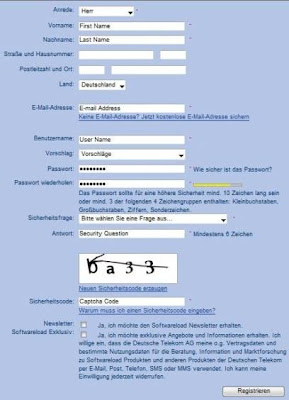 2. Fill in the required fields (those with * asterisk) such as title, first name, last name, email address, password, security question, security answer (if you don’t understand German, just pick anyone and type in any answer with at least 6 characters, just make sure you never forget the password!Then, click on “Registrieren” button.